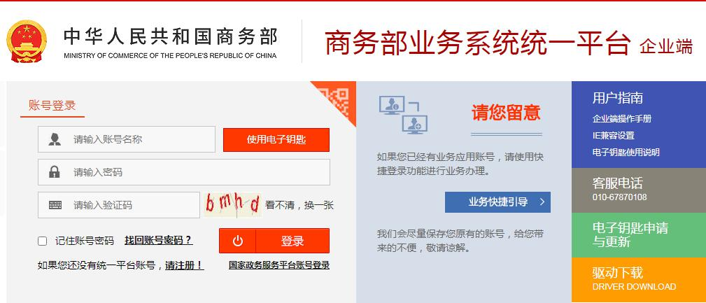 在电脑上插入电子钥匙,访问“商务部业务系统统一平台”。下载并安装驱动程序,输入密码登录。