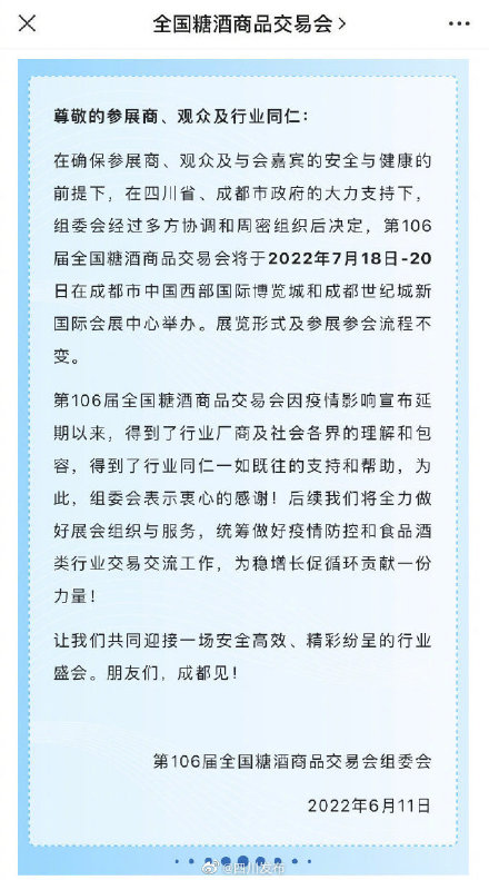 全国糖酒商品交易会6月11日发布消息:在确保参展商、观众及与会嘉宾的安全与健康的前提下,在四川省、成都市政府的大力支持下,组委会经过多方协调和周密组织后决定,第106届全国糖酒商品交易会将于2022年7月18日—20日在成都市中国西部国际博览城和成都世纪城新国际会展中心举办。展览形式及参展参会流程不变。
